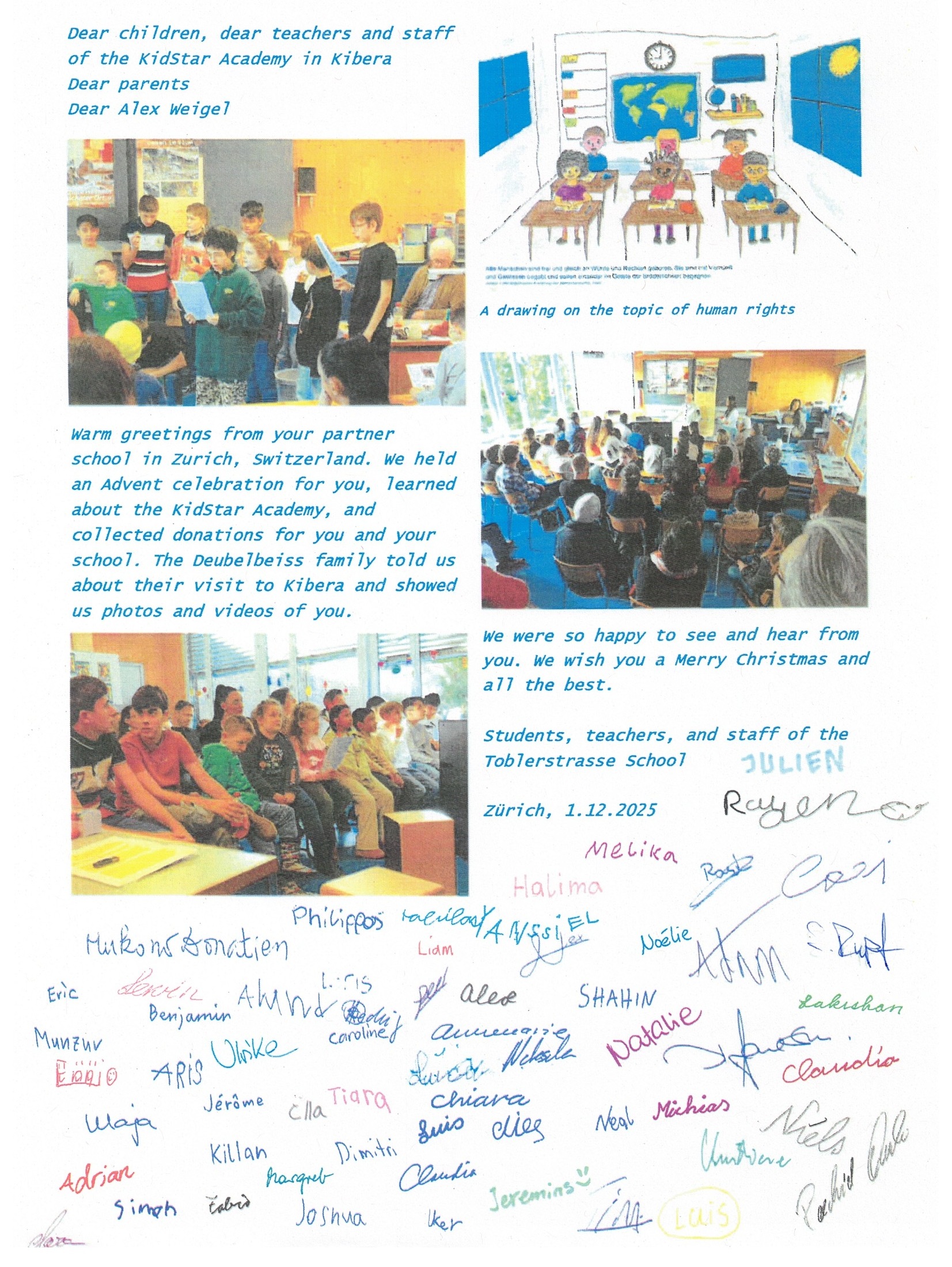 Warm greetings from your partner school in Zurich, Switzerland. We held an Advent celebration for you, learned about the KidStar Academy, and collected donations for you and your school. The Deubelbeiss family told us about their visit to Kibera and showed us photos and videos of you. We were so happy to see and hear from you. We wish you a Merry Christmas and all the best.