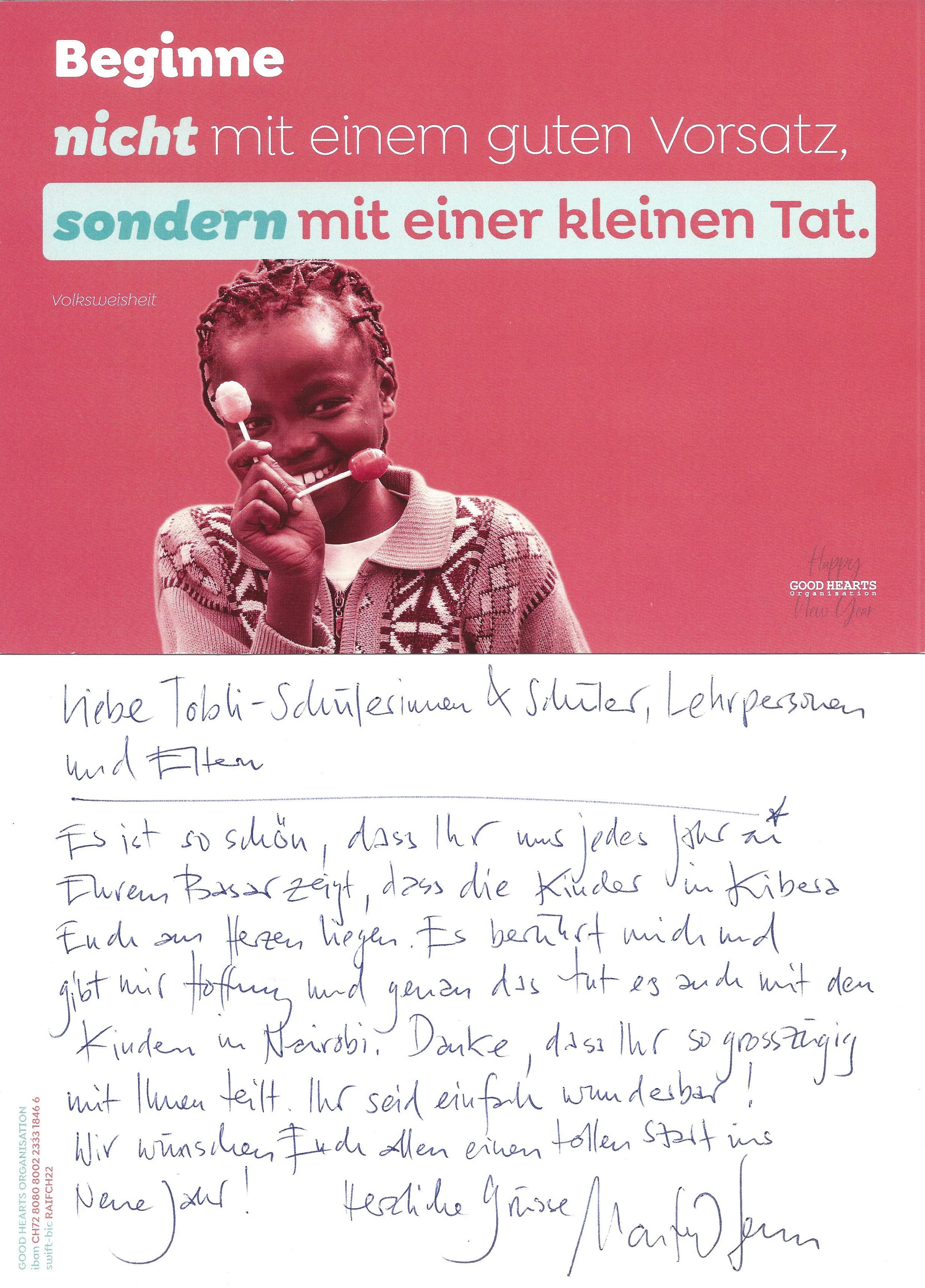 Manfred Senn, der Co-Präsident von Good Hearts, bedankt sich persönlich mit einer Karte.